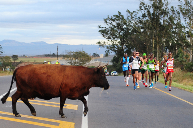 A cow crosses ahead of a second group which included eventual 5th placer Leonid Shvetsov.